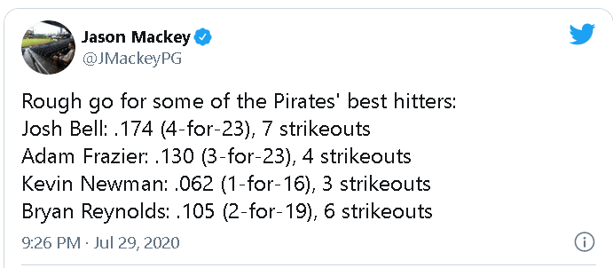 The offense was simply inept and the awful start for the Pirates supposed best hitters continued, Jason Mackey summed it up in the 6th with this Tweet.