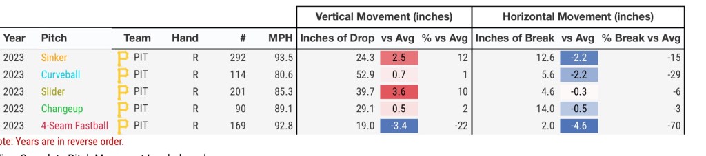 2. Great read. A lot of information that you made simple enough for me to understand. I hope you’re right about the innings being an issue on velocity but it seems rather strange for the 4 seam to have less velocity than the sinker. Big drop in velocity is a concern for Pirate pitchers so I hope that they aren’t “fixing” another pitcher. Looking forward to seeing what he can do from day one.