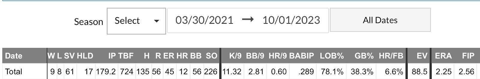 In 58.1 innings pitched between the Kansas City Royals and Texas Rangers, Chapman posted a 3.09 ERA, 2.84 xERA and 2.52 FIP. His control is an issue as he walked 14.5% of batters faced but his K% was 2nd best in baseball at 41.4%, behind just the Orioles closer, Felix Bautista (46.4%) among qualified relievers.