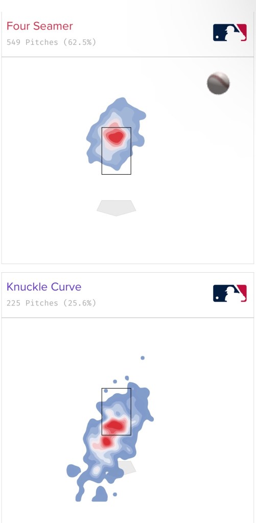 Paxton mostly throws a low-90s fastball up in the zone and low-80s knuckle-curve down and under the zone. He also offers a low-80s cutter and changeup but almost 90% of the time, he’s worked fastball/curve this year.