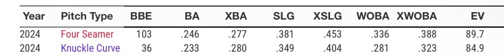On the surface, Paxton is getting solid results from his main offerings but over-performing his expected metrics as his xERA (5.24), FIP (5.36) and xFIP (5.39) are all MUCH higher than his ERA.