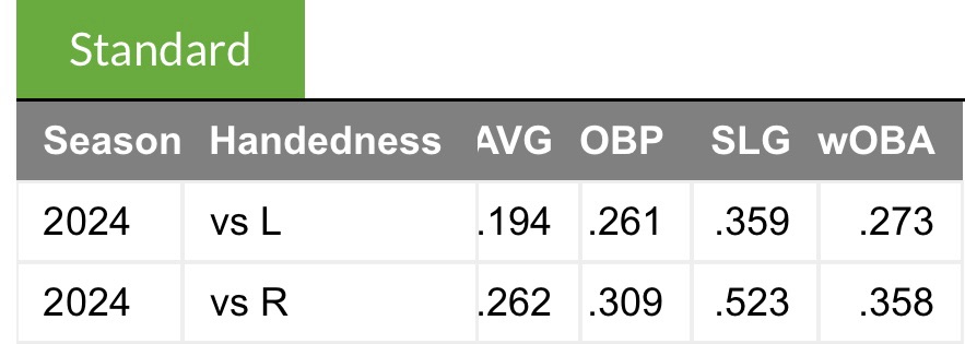 Ober has some reverse splits with righties performing considerably better against him than lefties as 8 of his 11 home runs allowed have been surrendered to RHH.