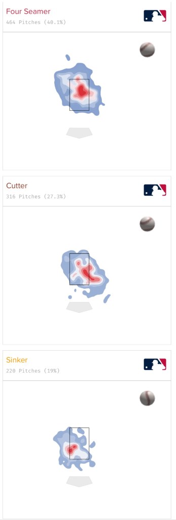 Looking at Lynn’s arsenal, his main 3 pitches are all around the same high-80s/low-90s range, working a 4-seam fastball, cutter and sinker with infrequent low-80s slider and mid-80s change.
