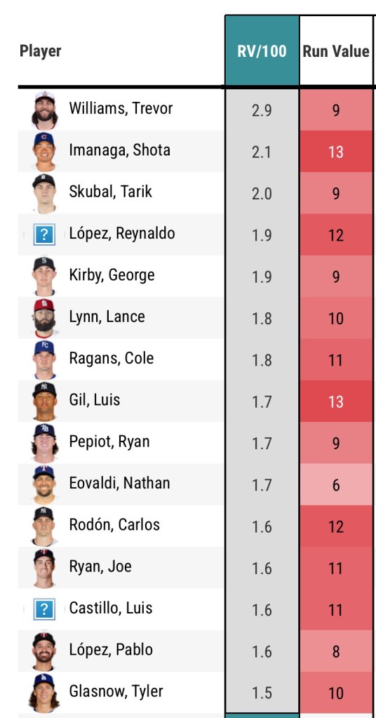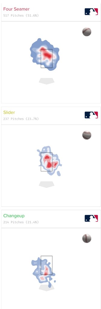 He has a very lively fastball with one of the best run values in all of baseball at 1.7 RV/100. This is buttressed by a vertical break of nearly 3 inches above average, leading to a 35.5% whiff rate and oBA of just .130.