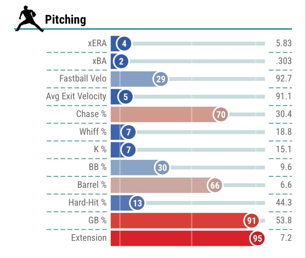 His xERA (5.82) is significantly higher than his actual ERA (3.51) to the extent that the gap between the two is among the highest in MLB. Eventually, those numbers regress at least closer to the mean.
