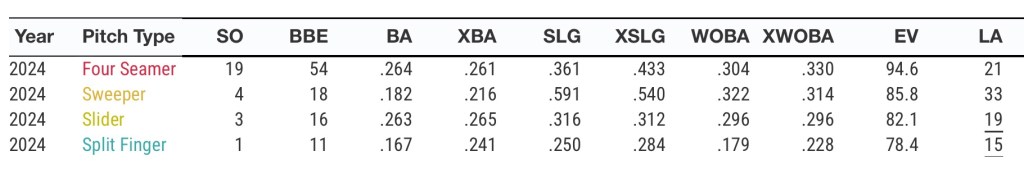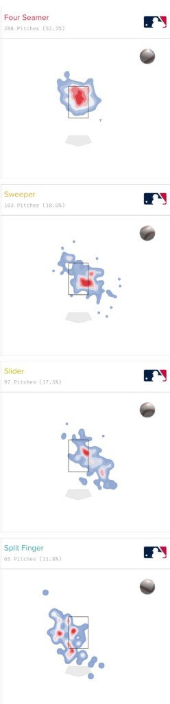 His pitch mix consists of throwing a mid-90s 4-seam, low-80s sweeper, high-80s slider and mid-80s splitter.