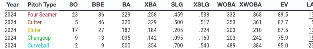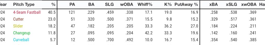 Myers isn’t going to overpower hitters, focusing on a 4-seam/cutter/changeup approach against LHH and leaning 4-seam/slider more when facing RHH as both the slider and changeup typically break down below the zone resulting in some bad looking swinging strikes.