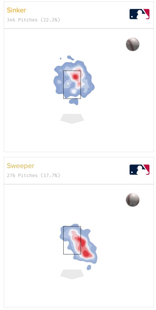 He’s typically paired the cutter and curve against LHH while dropping in the sinker/sweeper when facing RHH. The curve drops straight down and out of the zone so if a lefty is seeing horizontal movement on a pitch, they should just lay off it especially as it has the lowest expected batting average (.205) and expected slugging percentage (.345) among his offerings.