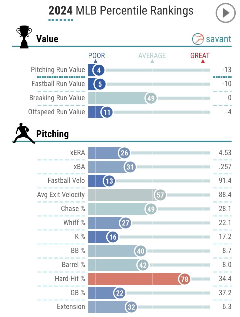Looking at his pitches, Flexen offers a low-90s 4-seam and high-80s cutter as his main options with a low-80s changeup, low-70s curve and high-70s slider – all of which have fairly pretty poorly overall for the veteran righty.
