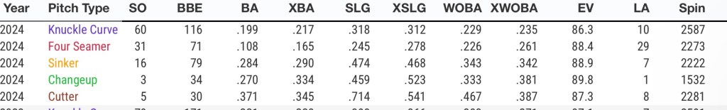 He’s never been a “hard-thrower” by any means, as his fastball sits low-90s while utilizing a high-70s knuckle curve as his main pitch.