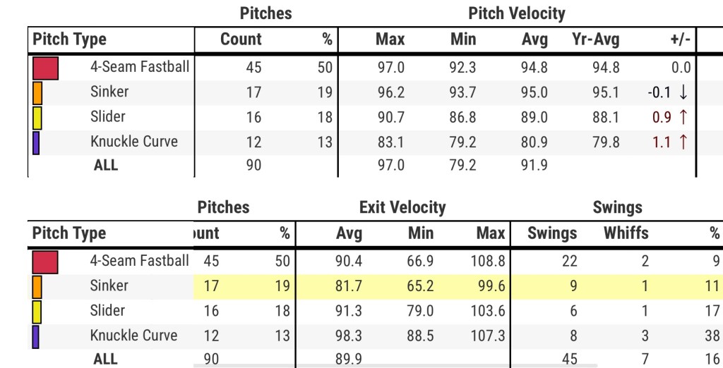 He was touching 97 on the heater last time around but Bucs bats whiffed just twice in 22 swings against the offering with an average exit velocity of 90.4 MPH.