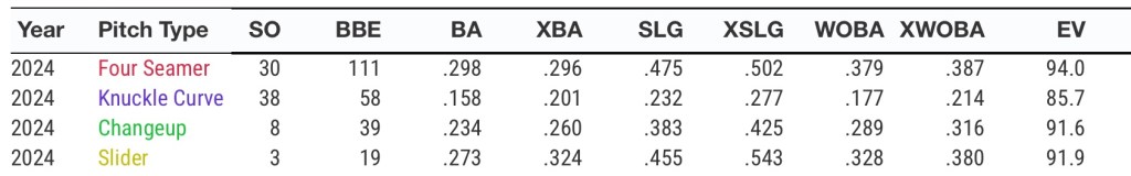 All of his pitches have been hit hard this year but he’s gotten some luck as the expected values for nearly all of his offerings are higher than the actual results.