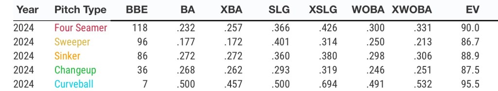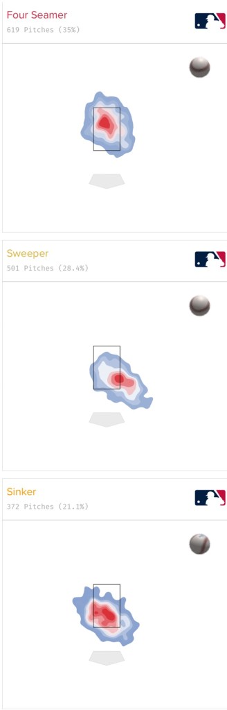His pitch mix mostly consists of a mid-90s 4-seam, a mid-80s sweeper and a low-90s sinker, while occasionally adding in a high-80s changeup and low-80s curve. But mostly, he’s throwing the first three options.