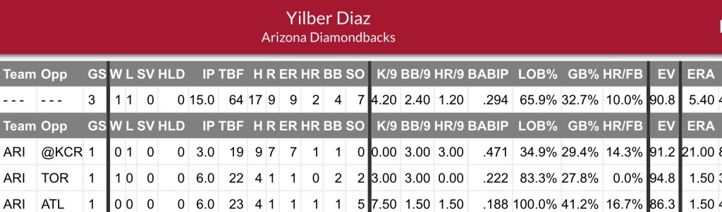 After posting a 4.03 ERA between AA/AAA, the 15th ranked prospect for the Diamondbacks (per MLB Pipeline), Diaz has made 3 MLB starts since his promotion earlier this month with two excellent outings followed by a real dud in his last game.