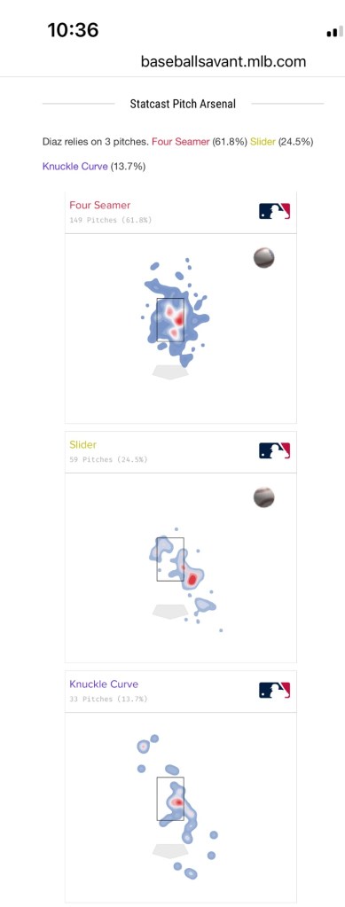 Diaz works mostly off his high-90s four-seam fastball with a low-80s slider and high-70s knuckle curve but control was a BIG problem in the minors and it is apparent in his pitch charts that this is still an issue for him.