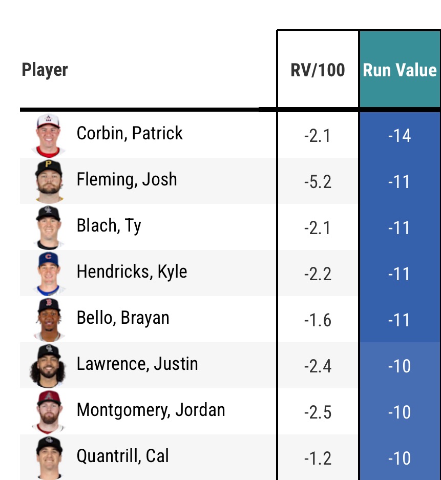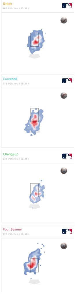 As you could probably surmise, this pitch arsenal have all fared poorly in both the face value and expected metrics but the changeup has been by far the LEAST effective, generating 4 of the 9 home runs surrendered in just 43 batted balls, leading to an oSLG of .604.