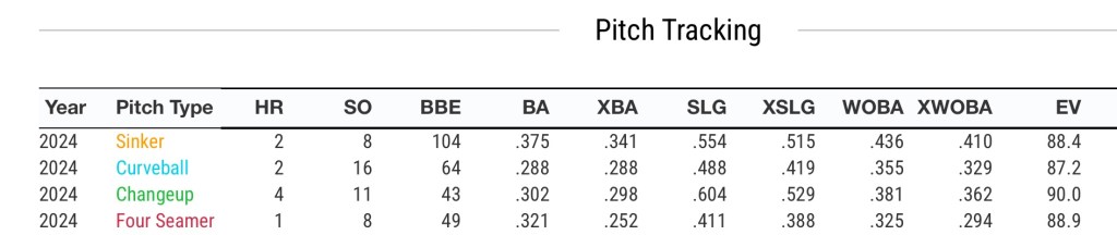 His sinker has also been hit hard and often with the highest xBA (.341) and highest wOBA (.436) with the lowest whiff rate (13.4%).