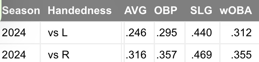 Nelson has posted some reverse splits this season with righties slashing .316/.357/.469 compared to a line of .246/.295/.440 from lefties.