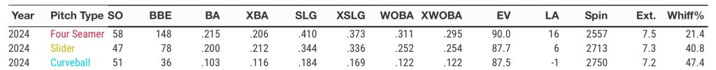 His fastball has been among the best in baseball but has technically been his most hittable pitch, with opponents crushing it at a whopping .215 clip, though they are slugging .410 with 9 of his 14 home runs surrendered coming against the heater.