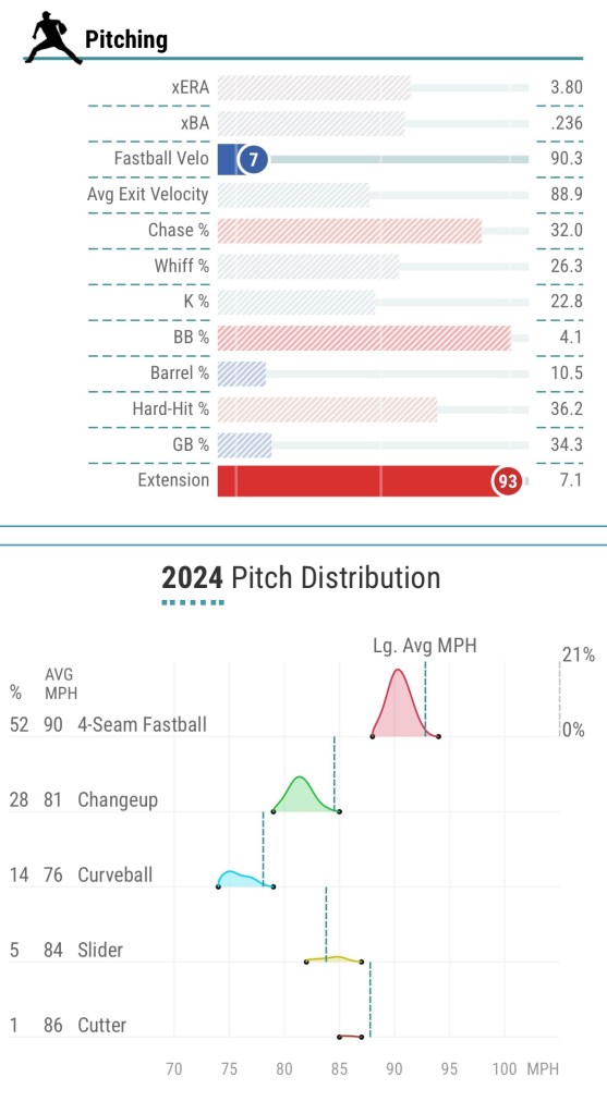 He’s a prototypical southpaw – tall and lanky, low velocity (his fastball averages 90) and a big extension, ranking in the 93rd percentile.