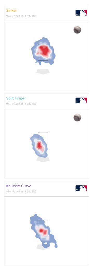 A first-time All Star in 2023, Cobb leans heavily on a low-90s splitter and mid-90s sinker, adding in a mid-80s knuckle-curve as a secondary offering with all of these pitches generating ground-balls while minimizing free passes.