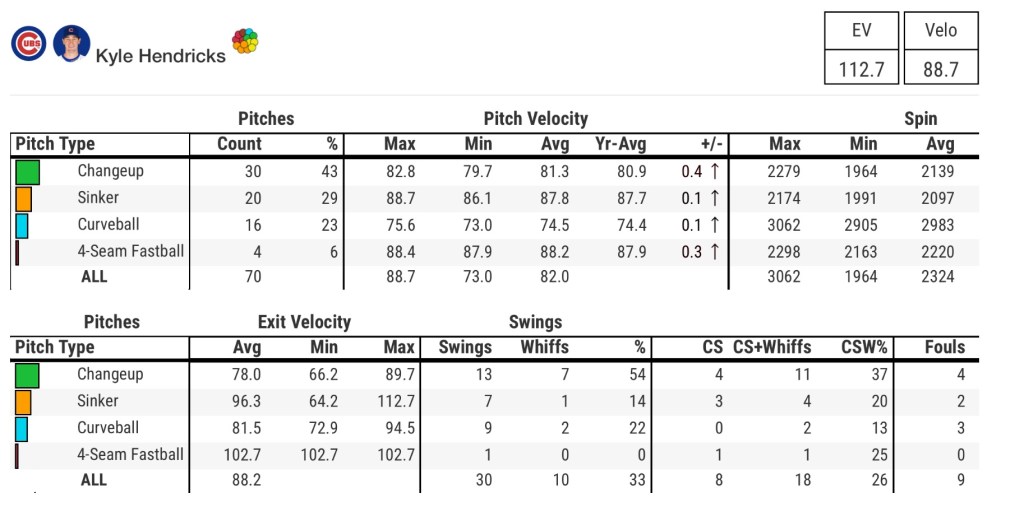 Despite the hot bats against Hendricks last time, he still generated 10 swings-and-misses in 70 pitches with most of that courtesy of his changeup and it’s 54% whiff rate.