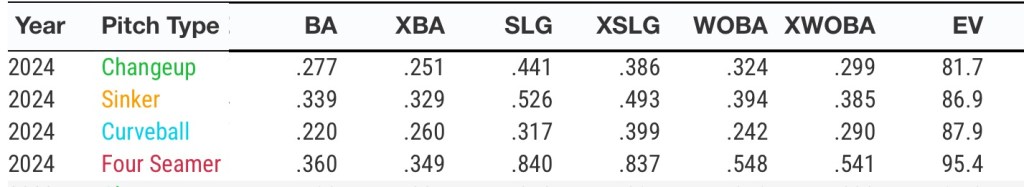 He was able to work the changeup on the corners and that’s the only pitch he has been able to consistently locate and avoid barrels against this season with the lowest xBA (.251) and xSLG (.386) among his offerings.