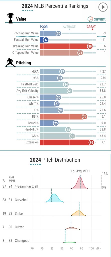 Mainly working with a low-90s 4-seamer/sinker and a low-80s curve, Irvin works in the zone and eats innings. He’s not going to strike out a lot of batters but his plus-extension works well to make his stuff play up a bit in a similar fashion to his mound opponent tonight, Bailey Falter.
