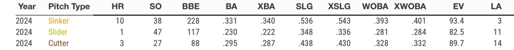 His arsenal consists of a heavy sinker/slider combination with the cutter added in almost exclusively against right-handed hitters.