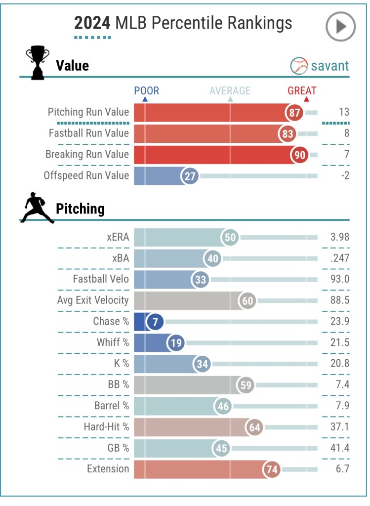 Hitters from both sides of the plate should target heat. The cutter has resulted in 10 of his 20 home runs allowed with both the highest SLG (.479) and xSLG (.446) among his offerings. His sinker isn’t too far behind in either category and has the highest average exit velocity (93.2 MPH), making it a BIG target especially as he can hang pitches from time to time.