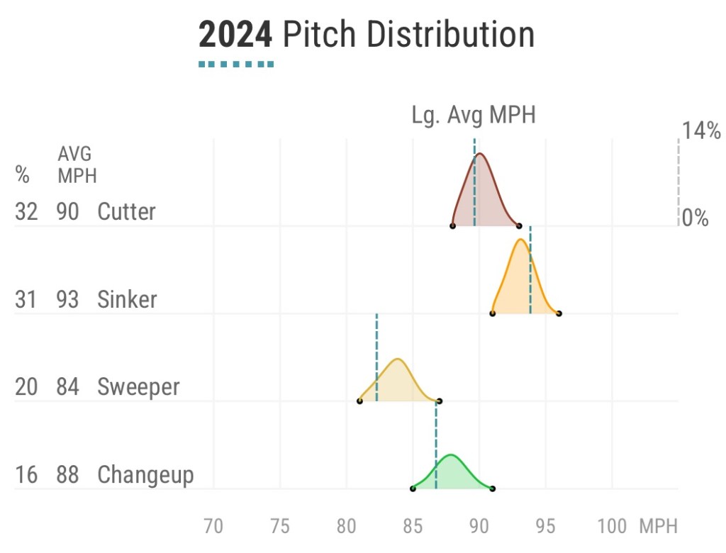 With a sweeper breaking down glove-side, Fedde typically works sinker/sweeper/cutter against RHH while dropping the sweeper and pivoting to changeup when facing lefties, falling down and in on opposing hitters.