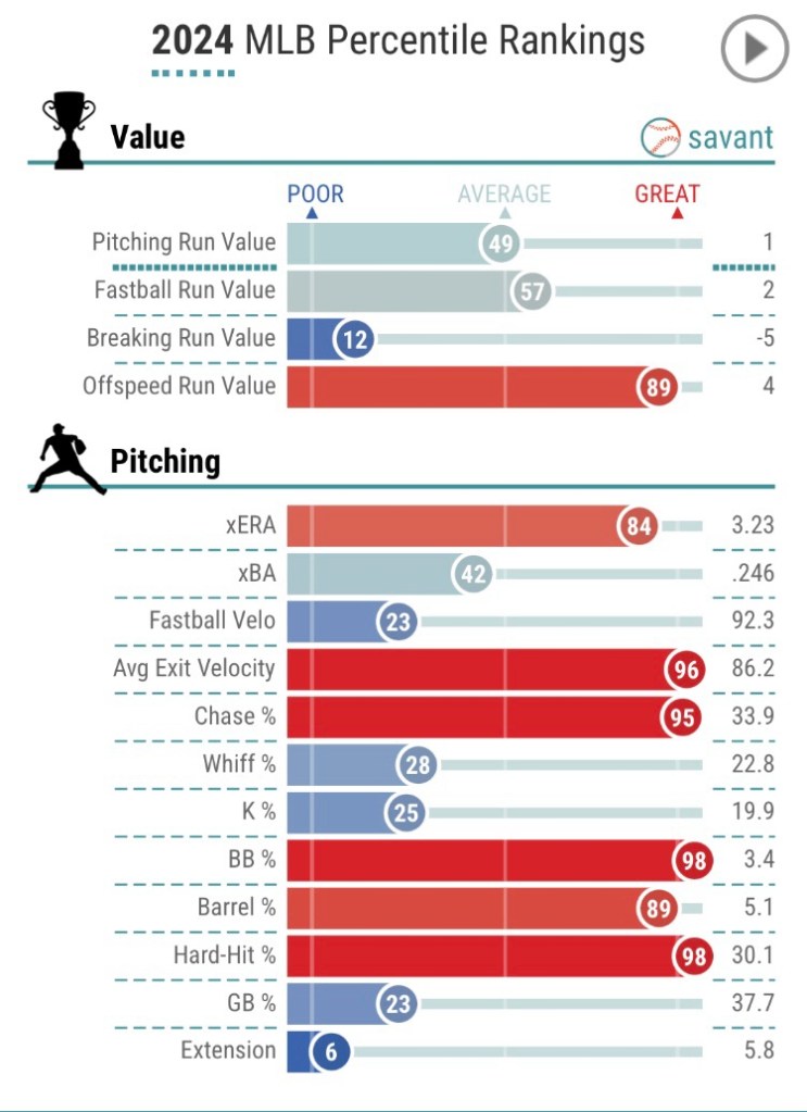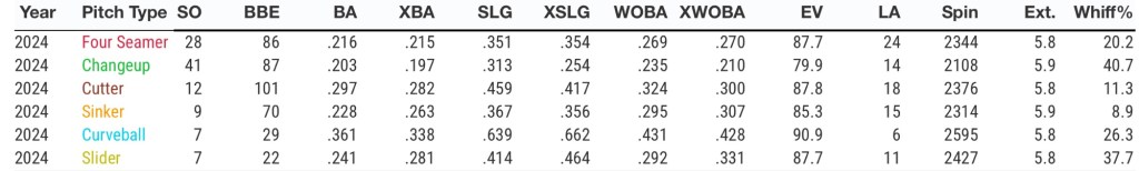 He has leaned more heavily on the sinker when facing righties while posting near equal numbers for the 4-seam, changeup and cutter versus left-handed hitters.