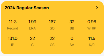7-6, ERA 3.32, 37 Games, 15 of which were starts, 1 save (his first), 135.2 innings pitched, 107 K’s, 42 Walks and a stellar 1.11 WHIP.