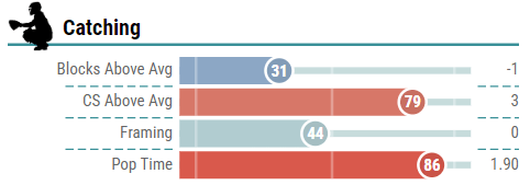 Aside from the hitting, though, I genuinely believe the most significant strength he brings to the Bucs is his defense. If you look at his Baseball Savant page, his pop time and caught stealing are above average.