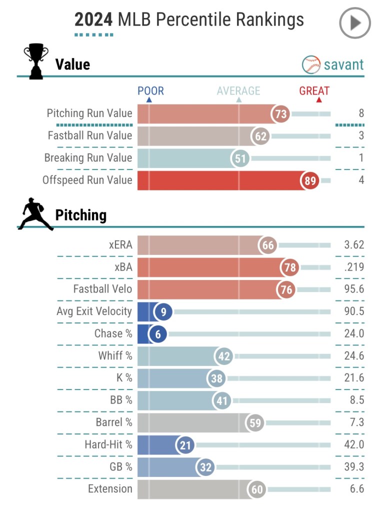 Fastball, naturally, has been his main pitch averaging 48% of his total pitches last season. He works in the slider/curve as supplemental offerings against righties and curve/changeup when facing lefties as he tries to work inside on hitters and prevent extension – because when hitters make contact against Baz, it’s typically pretty loud.