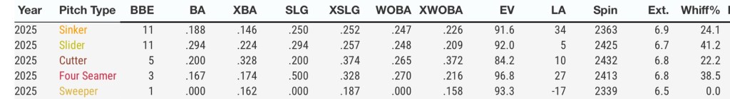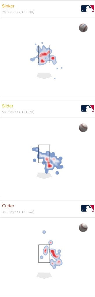Now, he’s ditched the changeup which was hit at a .429 clip last year and added a cut-fastball which he has deployed as a weapon against lefties and has proven successful in the early going, generating the lowest average exit velocity among his offerings.