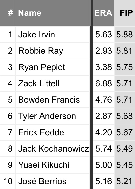 That said, even with that bloated ERA, Irvin’s peripherals indicate he could be even worse as his 5.88 FIP is the highest among all qualified starting pitchers, buoyed by below-average rates in both strikeouts (17.4%) and walks (8.7%) and coupled with some consistently hard contact against him.