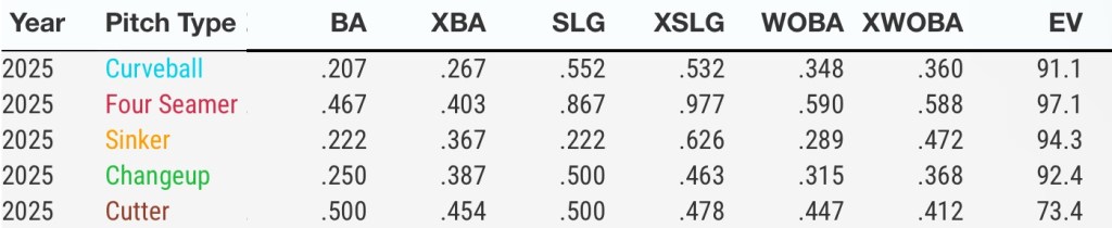 He adds in a 4-seam and sinker in the low-90s with the sinker used mostly against righties and the 4-seam dispatched versus left handed hitters. He also adds in the high-80s changeup as a weapon when facing lefties low in the zone and a cutter that has been tossed very infrequently as he doesn’t appear to have a great feel for the offering.