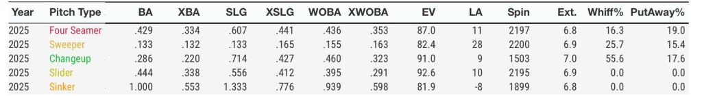 His 2025 stint hasn’t started out quite as well as he enters play today with a 7.36 ERA and 1.77 WHIP over his first 14.2 innings.