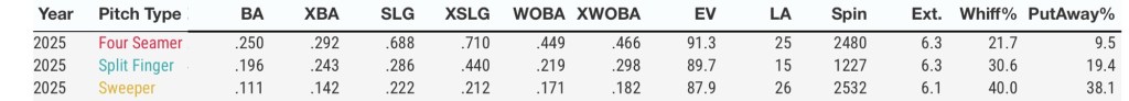 As we talked about last year, Imanaga has a varied pitch mix but has prominently utilized his low-90s 4-seam fastball up in the zone and low-80s splitter down and away against right handed hitters. He has increased usage on his sweeper – mostly as a weapon down and away against lefties – which sits around 80-81.