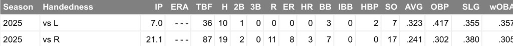 In a fairly small sample size, lefties have been experiencing success against Boyd, posting a .772 OPS over 36 plate appearances compared to .682 OPS for right handed hitters over 87 trips to the dish; however, over his career, those numbers have been flipped and likely revert to the mean over the course of the season.