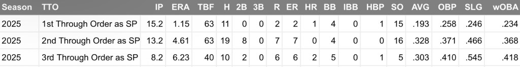 Peterson is the Mets version of Carmen Mlodzinski in that he is DOMINANT first time through the order and then falls off hard after that.