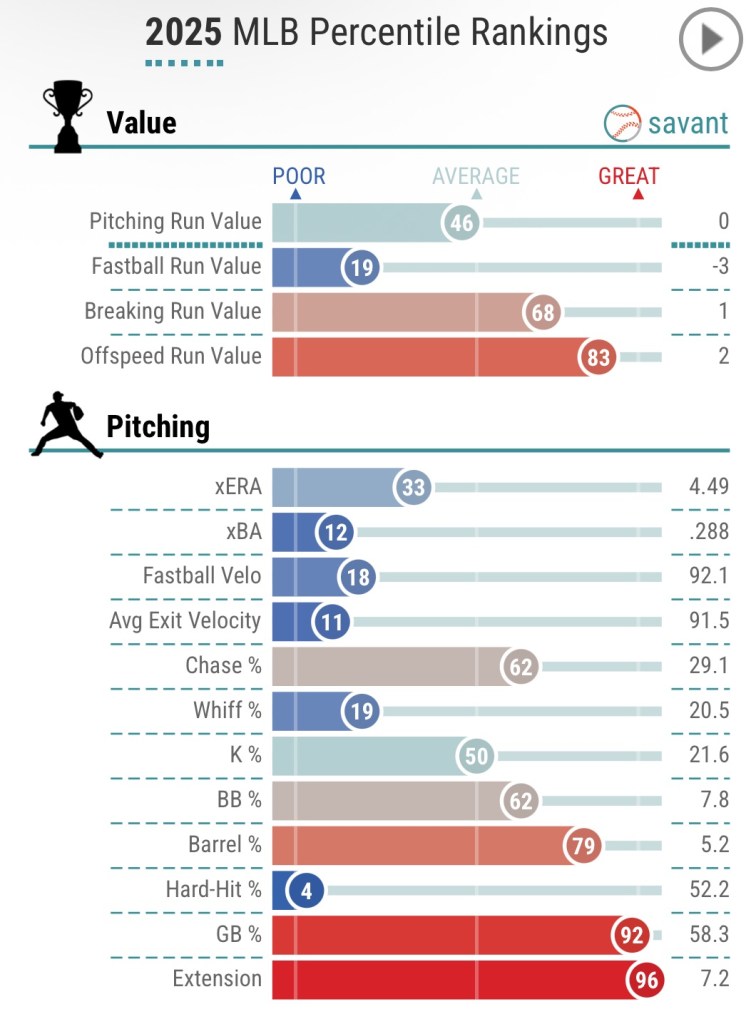 He primarily leans on his fastball as he offers a low 90s sinker/4-seam 53% of the time while adding his mid 80s slider/changeup and high-70s curve down in the zone to mix speed.