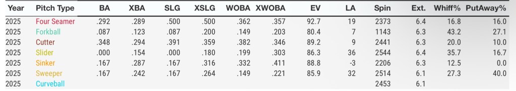 Unsurprisingly, opposing hitters are struggling against that forkball with a 44.2% K rate coming on the pitch as 23 of his 35 strikeouts have come against the offering.