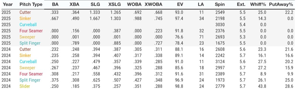 He’ll work cutter/curve/sinker mix to lefties, running in against opponents while pivoting to sinker, cutter and sweeper running down and away from righties.