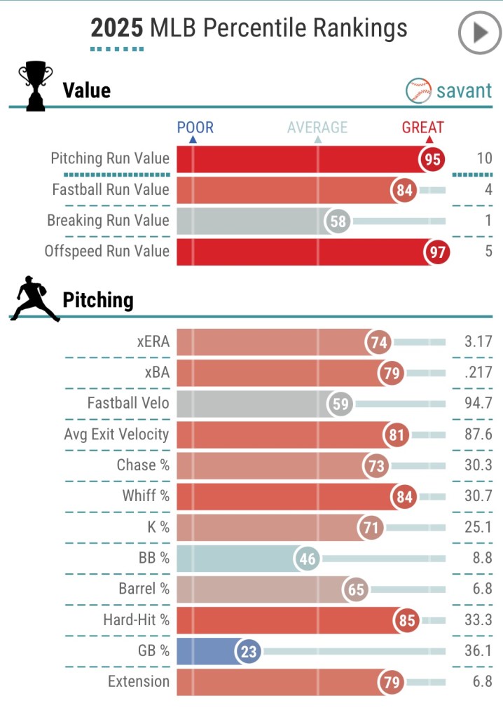Peralta focuses on a 3-pitch mix with a mid-90s 4-seam up in the zone, a high-80s changeup down and away from lefties and a low-80s curve that drops down under the zone – though, he also will infrequently mix in a low-80s slider with DEVASTATING results.