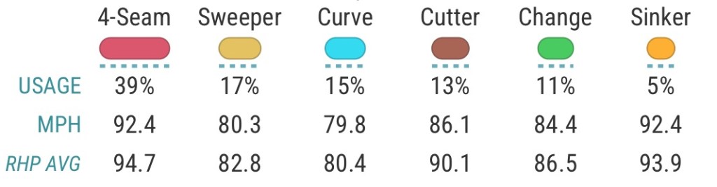 I covered Taillon previously (see here and here) and his arsenal is not changing much from last season. He is throwing his cutter less (13% down from 25% last year) and his changeup more (4% last season and 11% this year) but he’s still filling up the strike zone with fastballs and gets soft contact against his breaking stuff.