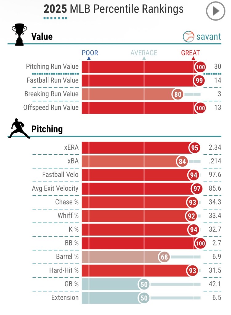 Opponents are batting just .196 against Skubal and his pitch mix consists of a high-80s changeup, a high-90s fastball (both a 4-seam and sinker) which has topped 103(!), a high-80s slider and an infrequent low-80s knuckle-curve – all of which grade as average-to-above average offerings and none of which have above a .230 batting average against.
