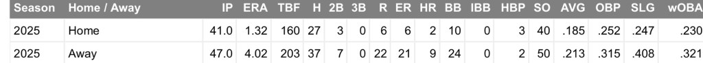 I discussed Peralta previously ahead of the Pirates matchup with him last month but right now, let’s talk about his splits – specifically, his home/away splits as he has posted a 1.32 ERA over 41 innings at home while pitching to a 4.02 ERA outside of American Family Field.