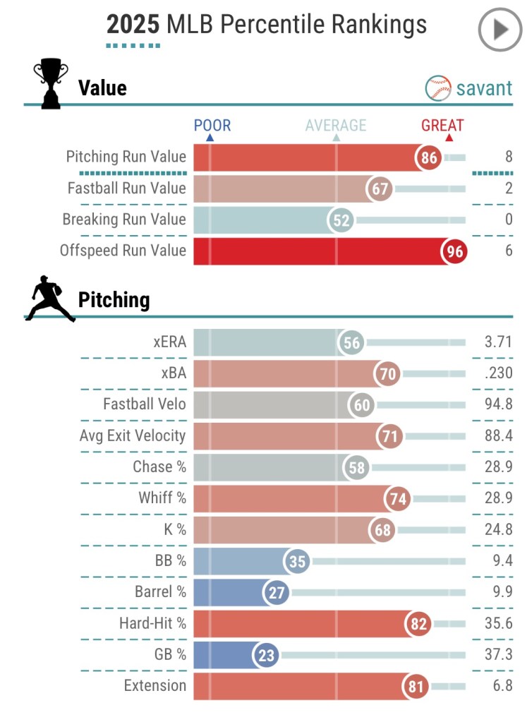 While both his 25% strikeout rate and 6.3% walk rates at home are sustainable and mostly within his control, he’s also benefited from an abnormally strong 91.4% strand rate when he toes the runner in Milwaukee this season. Additionally, while Peralta has maintained a strong 35.6% hard hit rate (82nd percentile), he gets barreled at a 9.9% clip (27th percentile) leading to a higher xFIP at home (3.84).